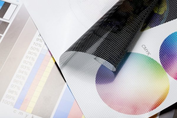 Vinilo microperforado semi transparente para ventana y escaparates, adhesivo color negro, permite la Visión desde el interior